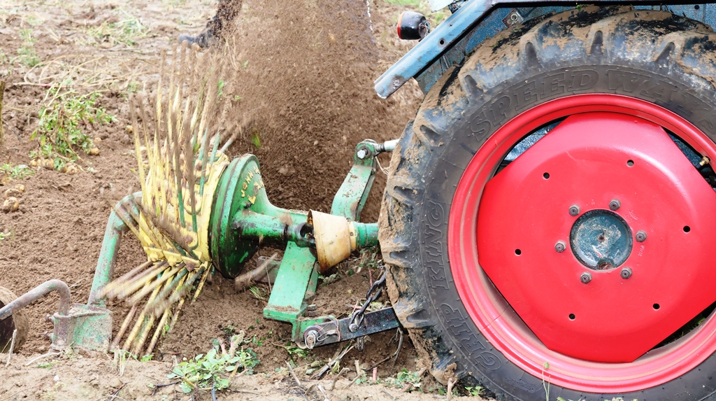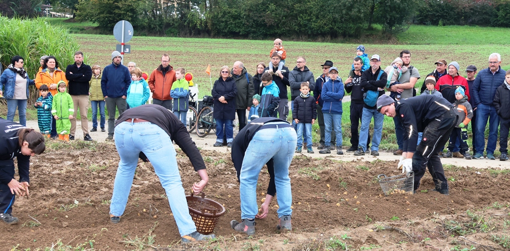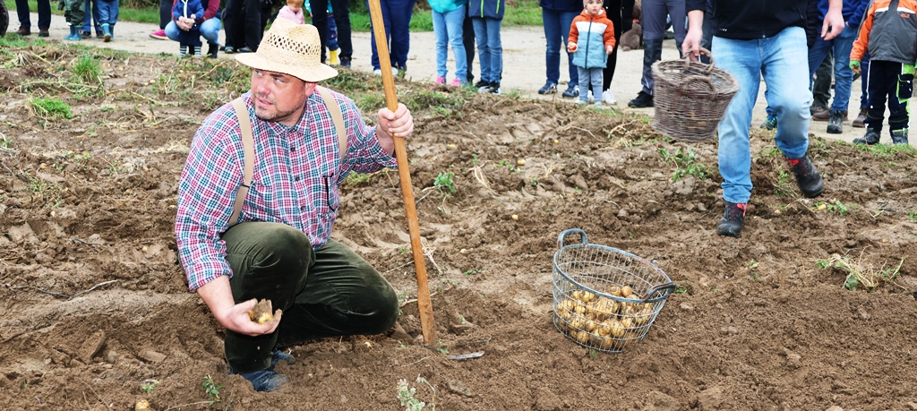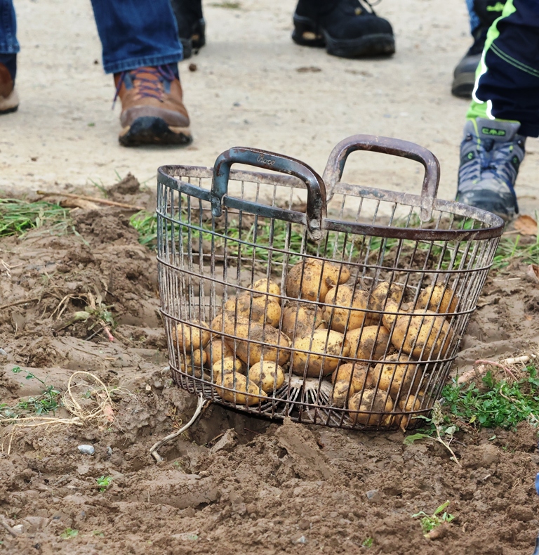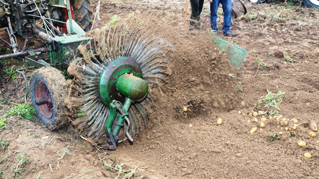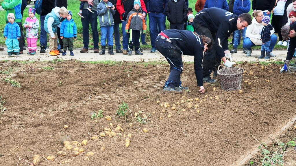 Auch bei der Kartoffelernte hat die technische Zeit seine Spuren hinterlassen. Ursprünglich war die Kartoffelernte noch anstrengende Handarbeit. Mit dem „zweizinkigen Karst“ rückte man, den in Zeilen verlegten Kartoffeln, zu Leibe, um sie möglicht unbeschadet an die Oberfläche zu bringen.