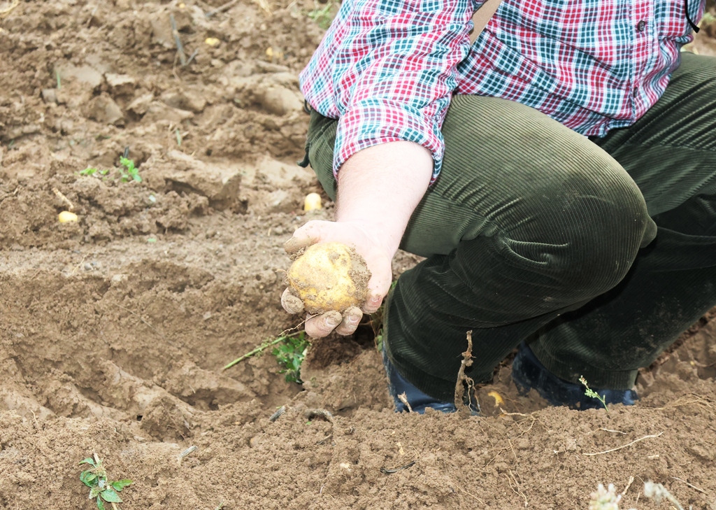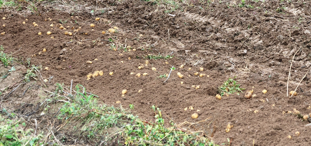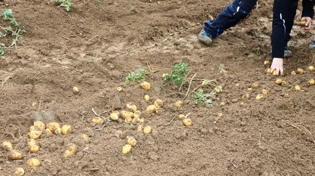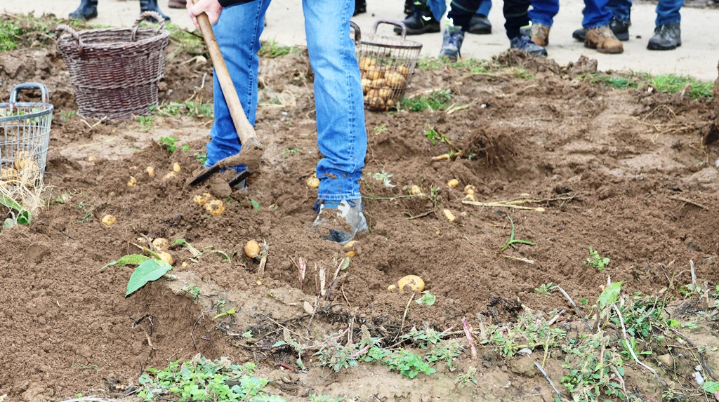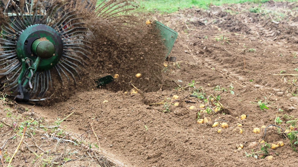 Auch bei der Kartoffelernte hat die technische Zeit seine Spuren hinterlassen. Ursprünglich war die Kartoffelernte noch anstrengende Handarbeit. Mit dem „zweizinkigen Karst“ rückte man, den in Zeilen verlegten Kartoffeln, zu Leibe, um sie möglicht unbeschadet an die Oberfläche zu bringen.