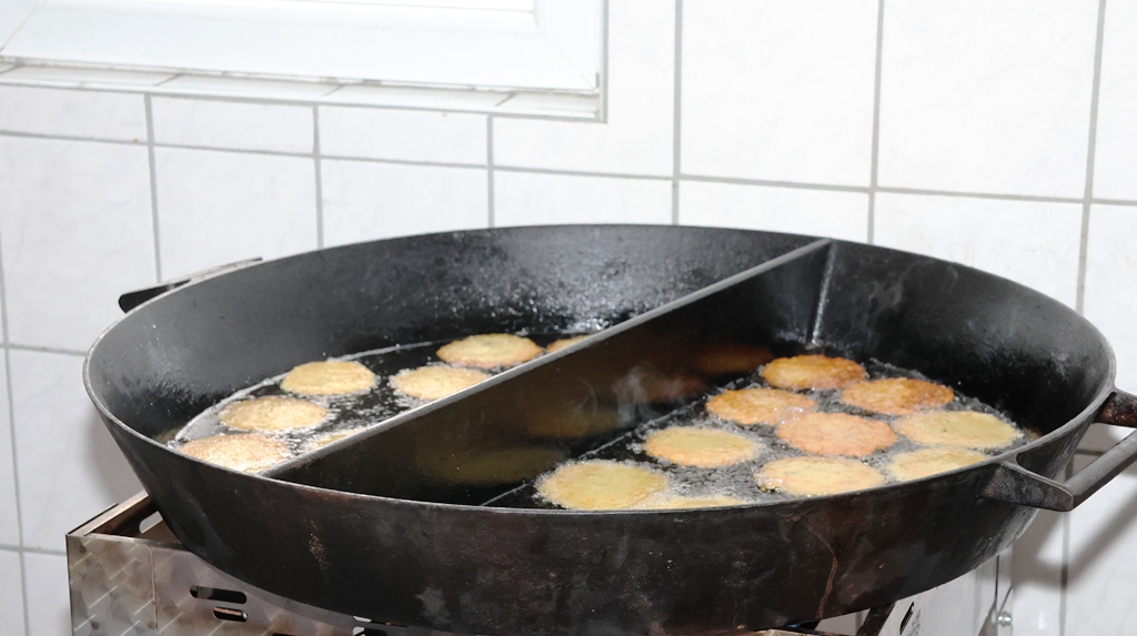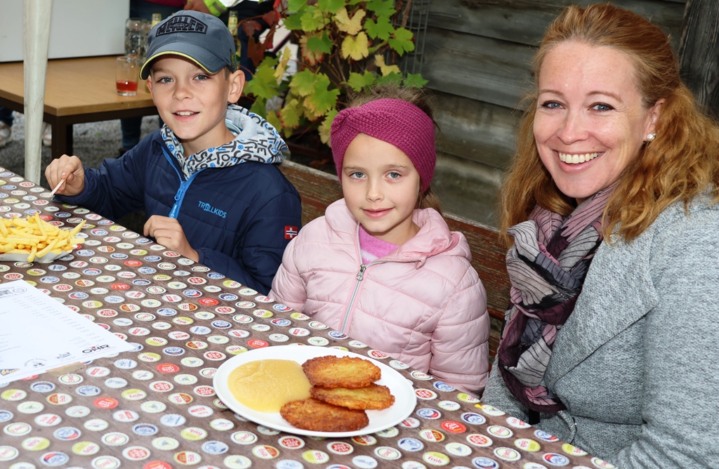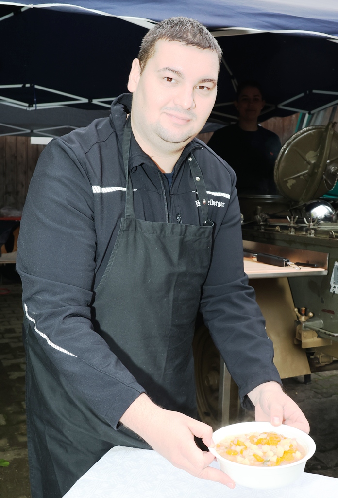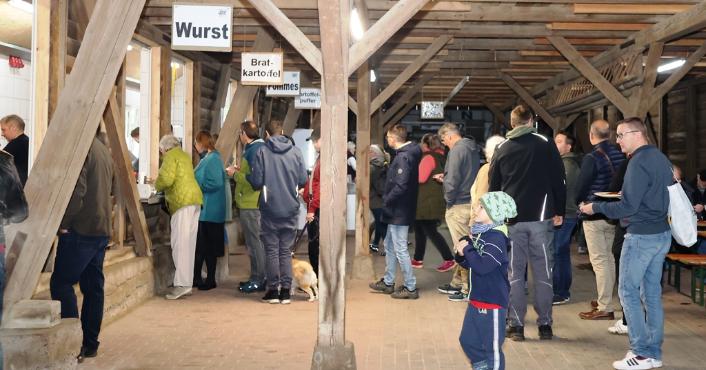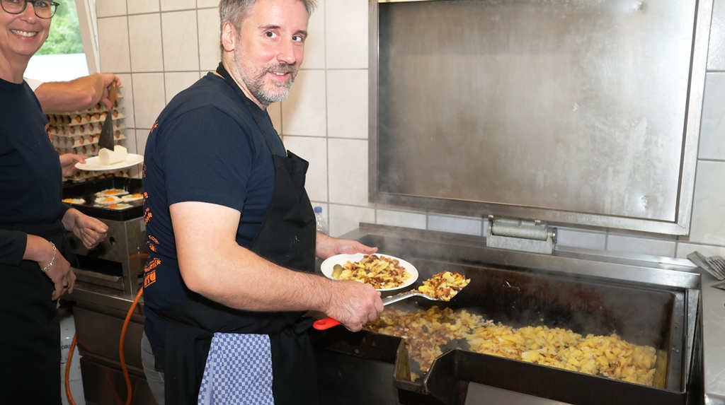 Nach diesem letzten Akt der Vorführung ging es langsam zurück zur Dreschhalle, wo man alles zur Verköstigung vorbereitet hatte. Über 6 Zentner Kartoffeln wurden geschält, um die Leib & Magenspeise „Bratkartoffel mit Spiegelei“ zubereiten zu können. Es gibt sogar ein Song von Hanne Haller, mit entsprechendem Titel!