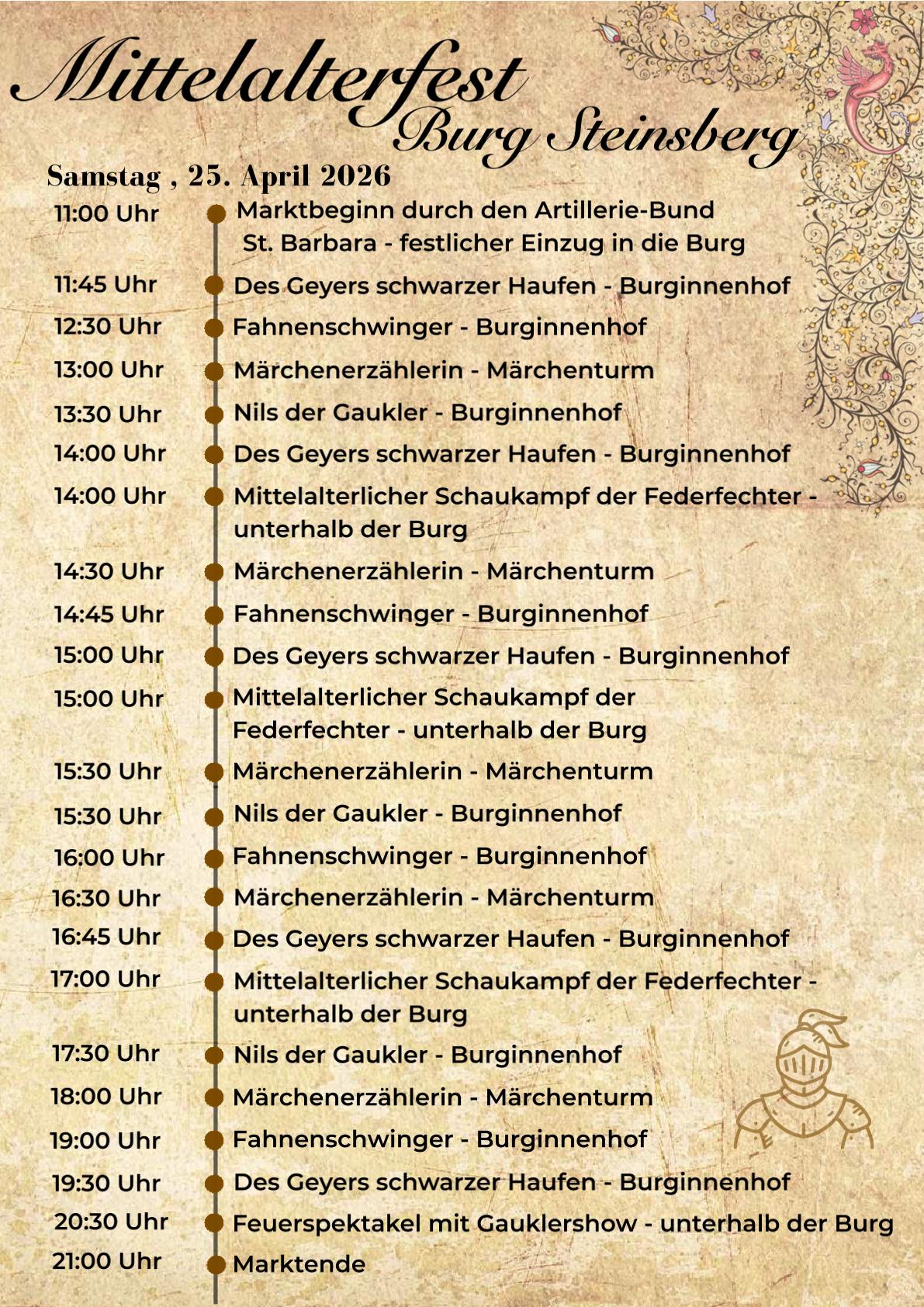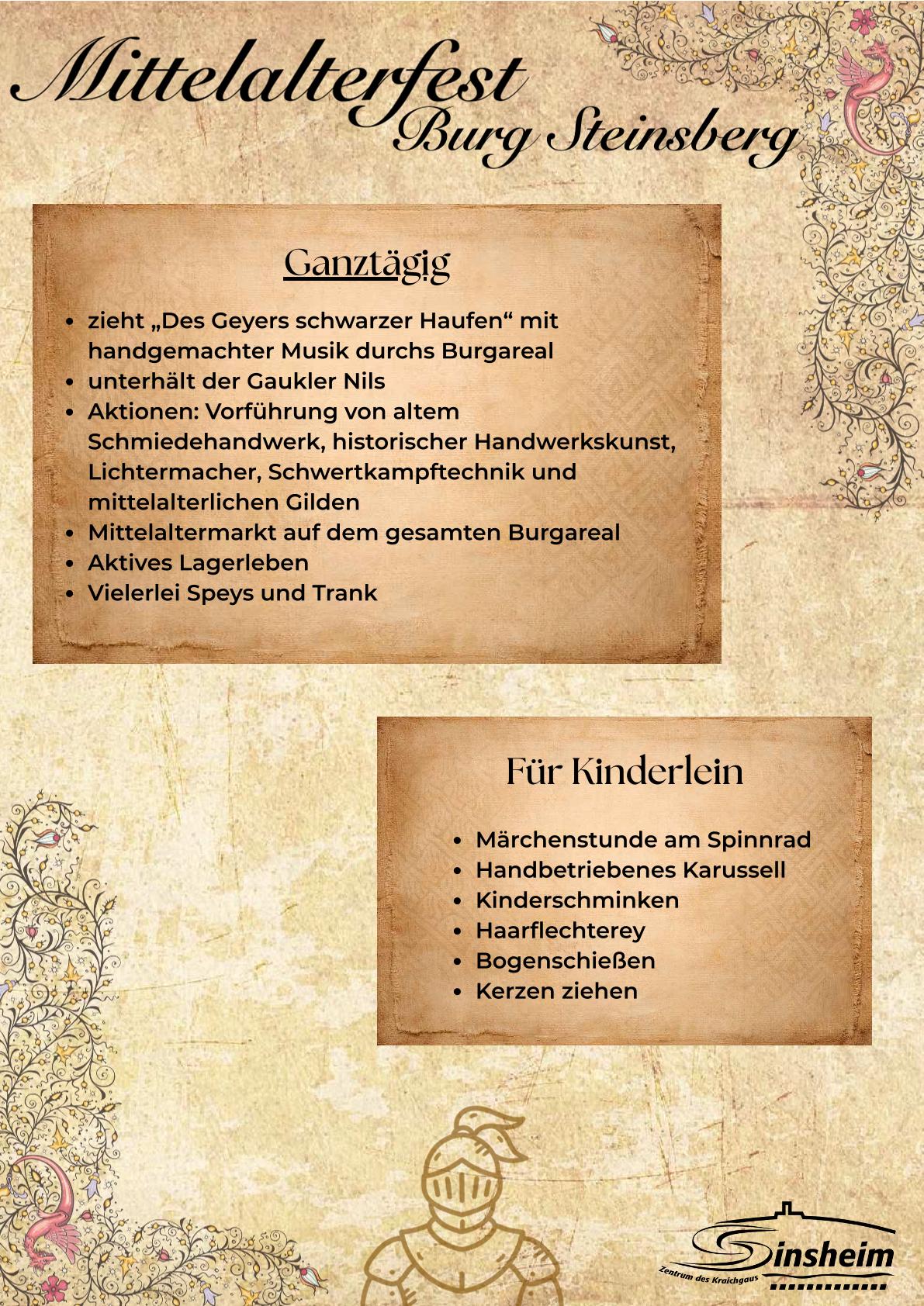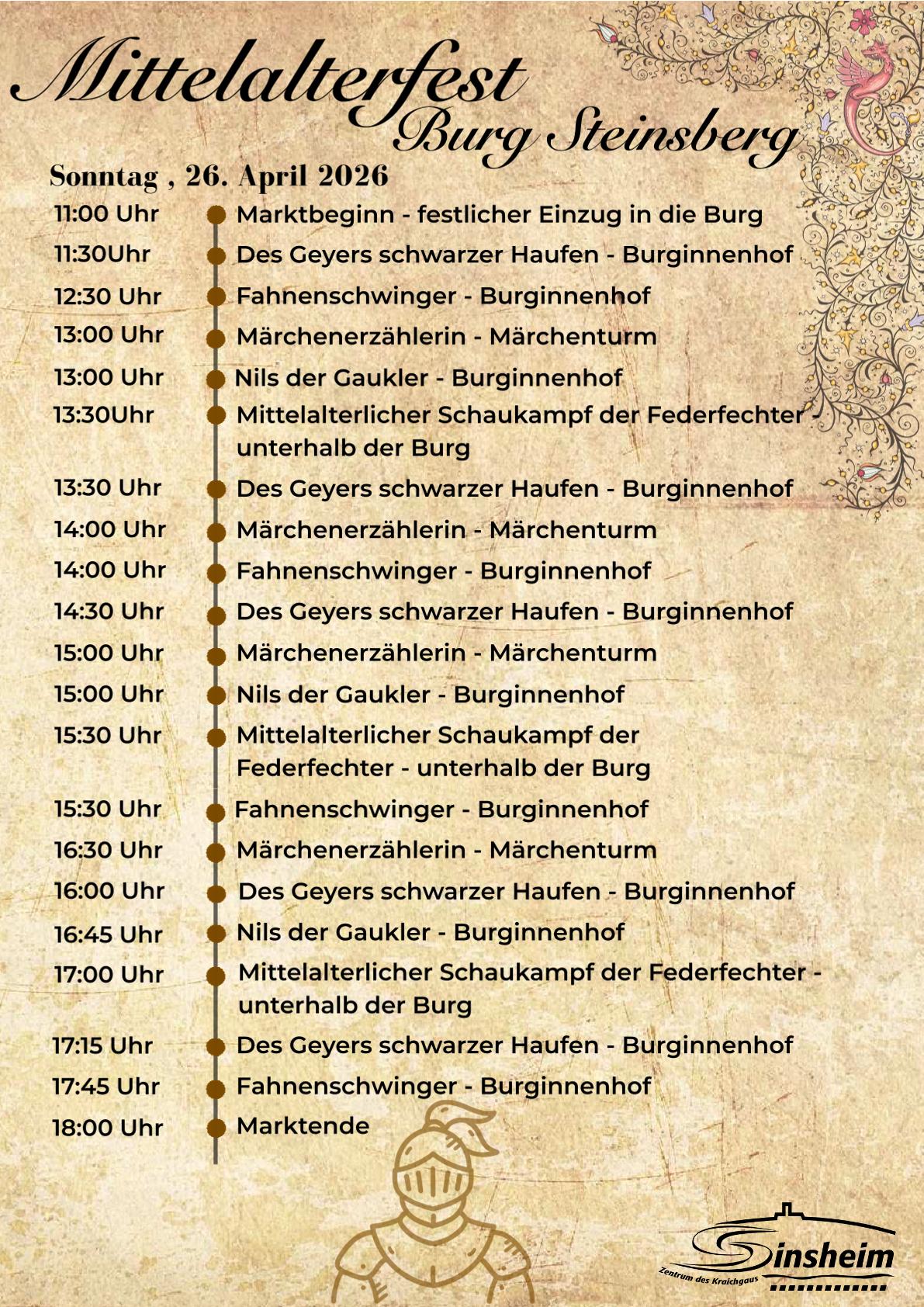 Am Samstag, 25. April und Sonntag, 26. April 2026, lassen tapfere Ritter, edle Burgfräulein, zünftige Handwerker sowie fleißige Mägde und Knechte das einst mittelalterliche Leben auf der Burg Steinsberg wiederaufleben.