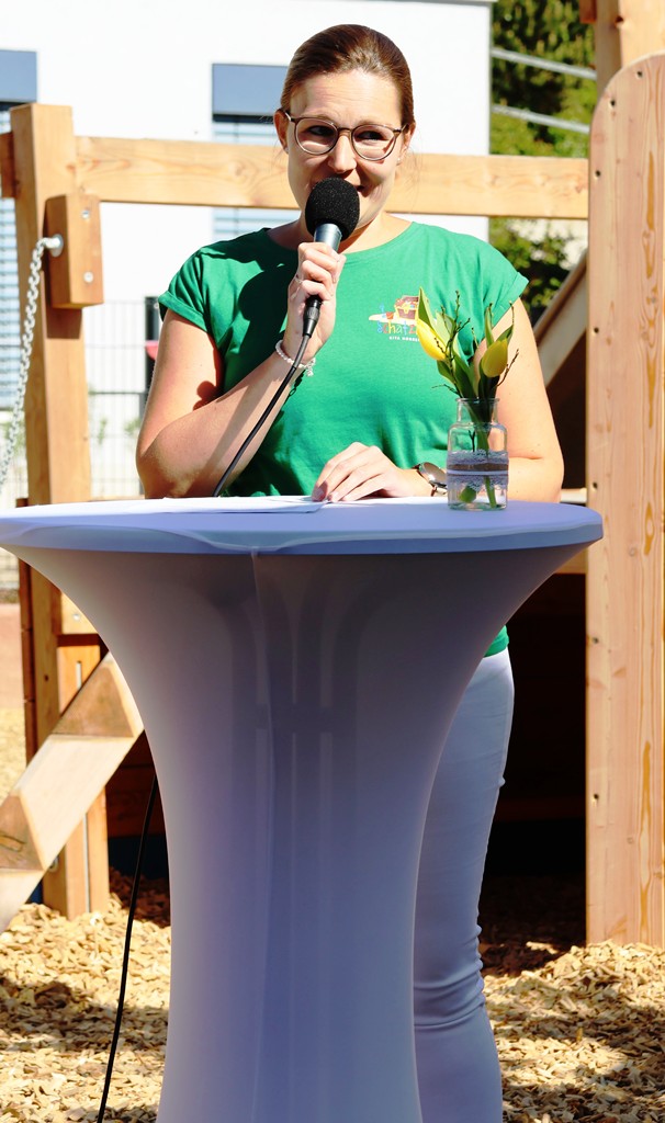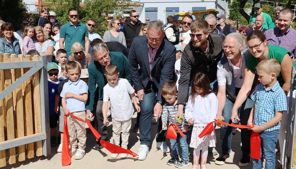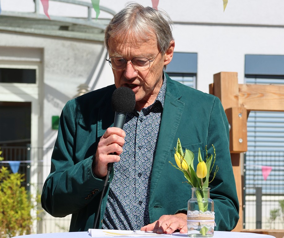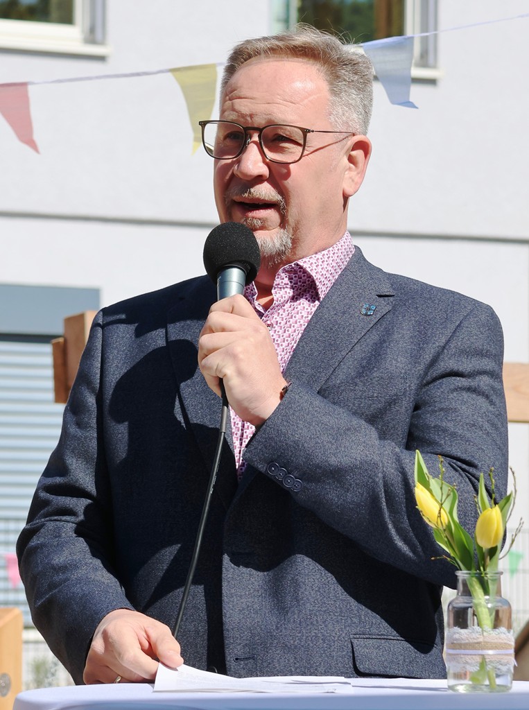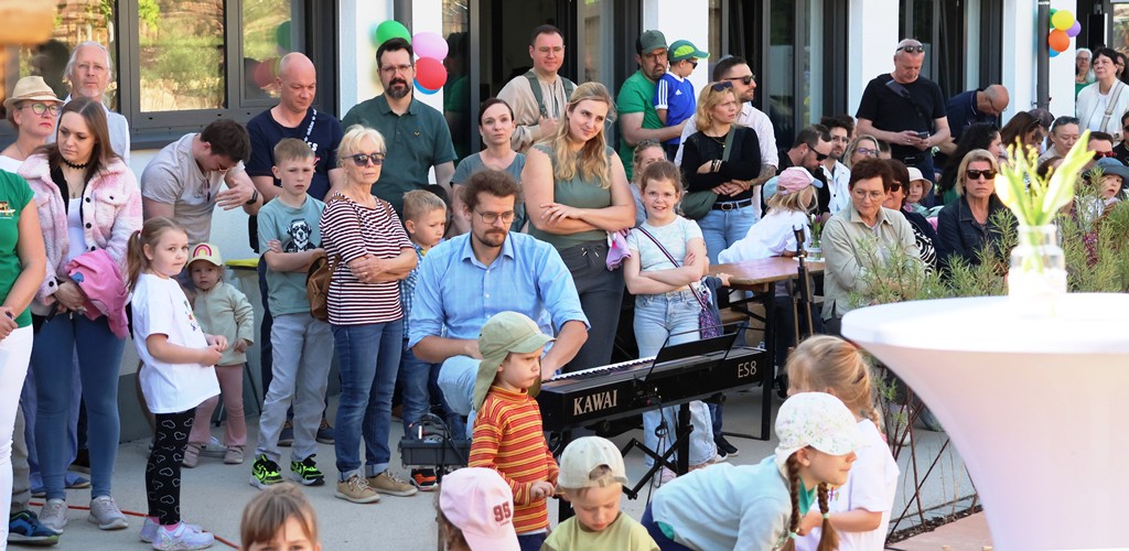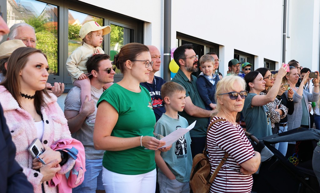 Felix Weber, ein Freund aller Kinder, begleitete das Eröffnungslied mit sinnvollem Titel : „Im Garten“. Zuvor hatte die Leiterin der KiTa, Julia Ramp, die anwesenden kleinen und großen Gäste begrüßt. Man merkte ihr die Freude an, die an diesem Tag wohl jedem ins Gesicht geschrieben stand. Nach dem Liedchen, das bei allen Besuchen großen Beifall ausgelöst hat, waren Bürgermeister Thomas Glasbrenner und Ortsvorsteher Harald Seib an der Reihe ihre Grußworte an die Anwesenden zu richten. Glasbrenner resumierte das Projekt von der Planung bis zum heutigen Tag kurz in wenigen, aber erklärenden Worten.