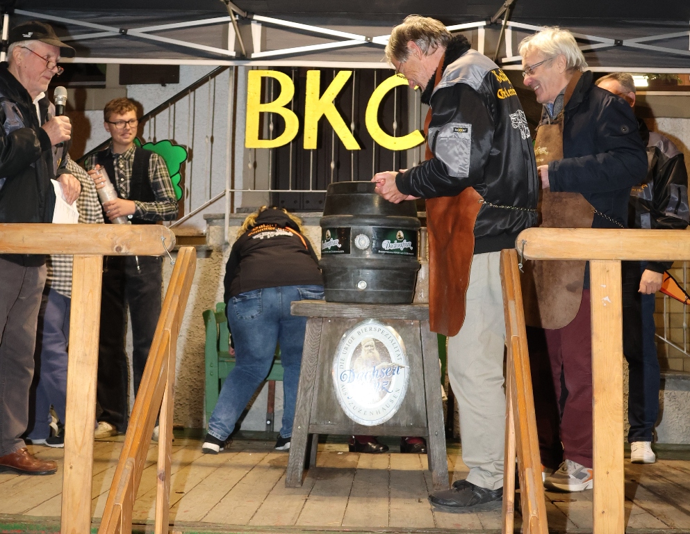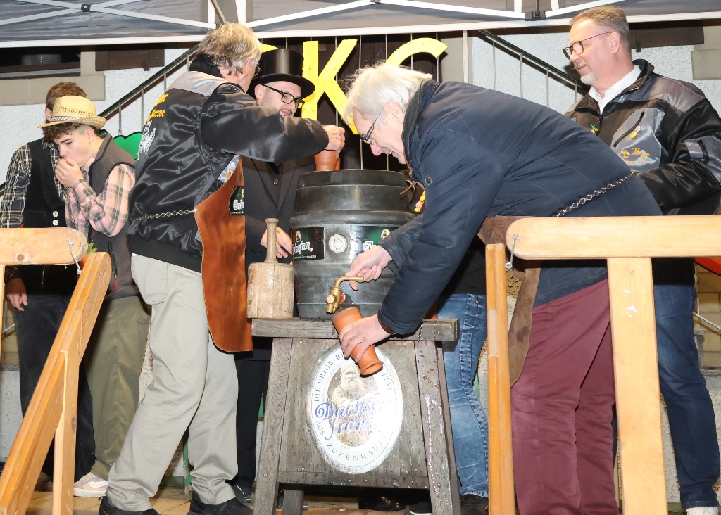 Dabei muss man sagen „flieg nicht so hoch mein kleiner Freund“, denn wir waren nicht auf einen so hohen Sprung vorbereitet. Zügig ging es weiter mit dem Verlesen der KERWEREDD, welche Begebenheiten in den Vereinen und im Ort persifliert zur Sprache brachte. Es folgte ein weiteres Musikstück, während dessen brachte man das Fässchen Bier, wie immer von der „Dachsenfranz – Biermanufaktur“ Wilhelm Werner gestiftet, in Position, ebenso die obligatorischen BREZEL, die wieder vom Ortsvorsteher Harald Seib eingebracht wurden. Dieser nahm auch den Fassanstich vor.