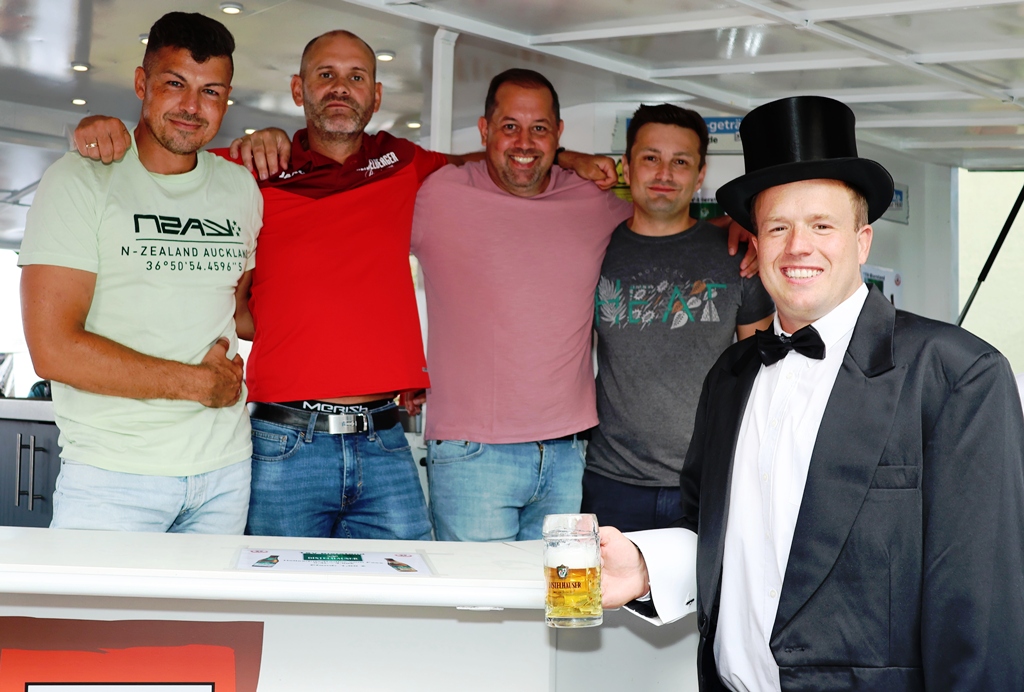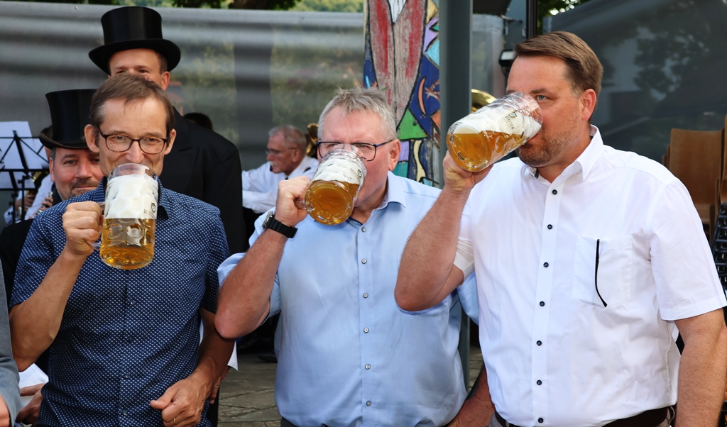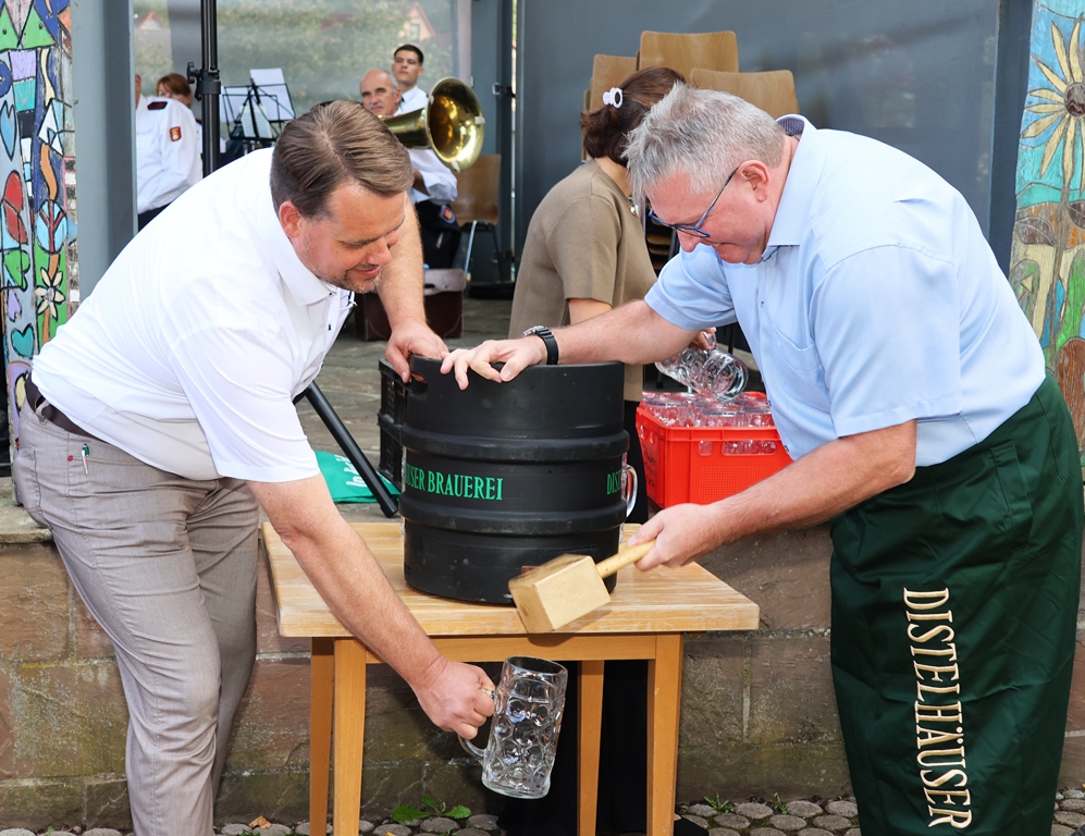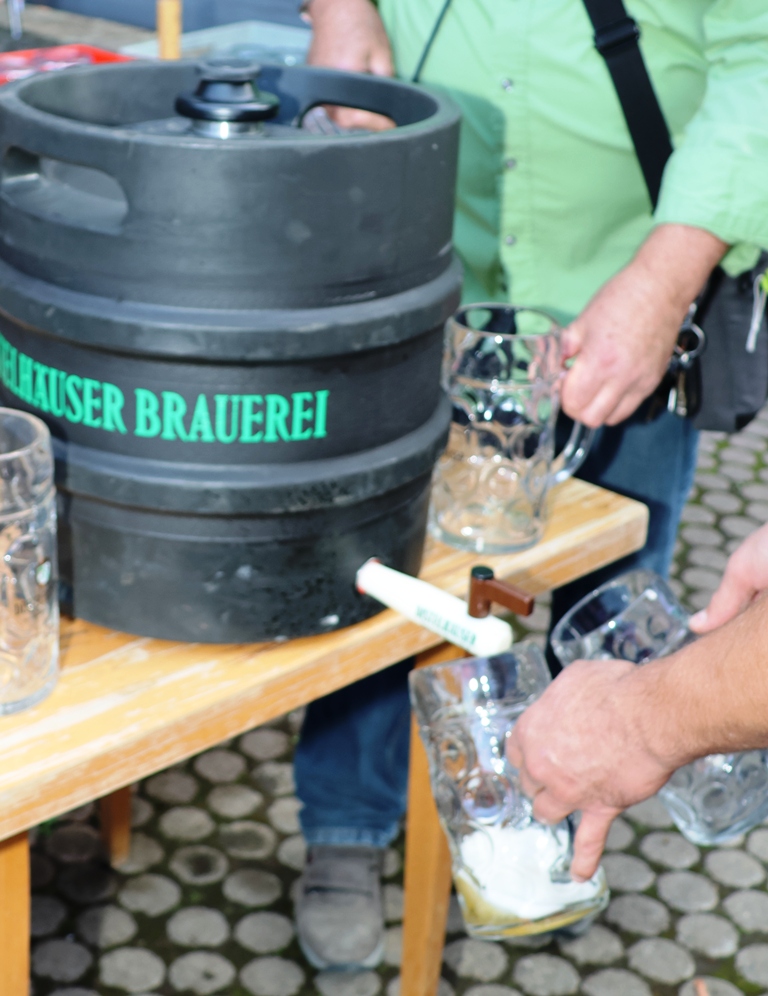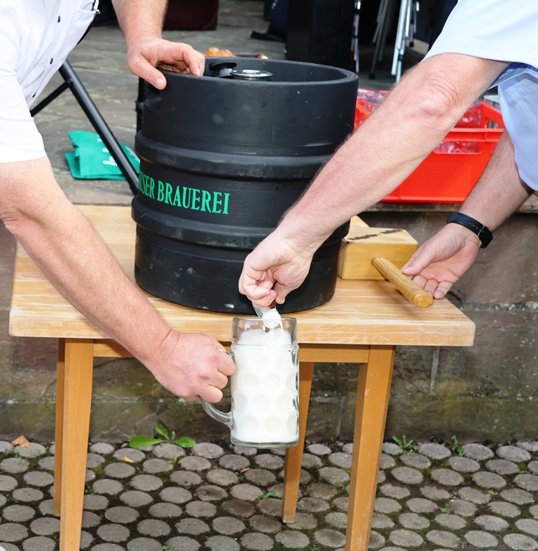 Jetzt ging es daran das „Freibierfässchen“ in Position zu breingen – Anstich wurde vom OV Speer deligiert und bestimmte Bürgermeister Kippenhan zum „Thor mit dem Hammer“ – gekonnt, mit nur zwei Schlägen, entlockte er dem Fässchen, dieses Jahr von der „Distelhäuser Brauerei“ gesponsert, den goldgelben Gestensaft! Zunächst wurden, wie immer, die „Ehrengäste“ versorgt. Man prostet sich zu und schließlich wurde das Fässchen für die Allgemeinheit freigegeben!