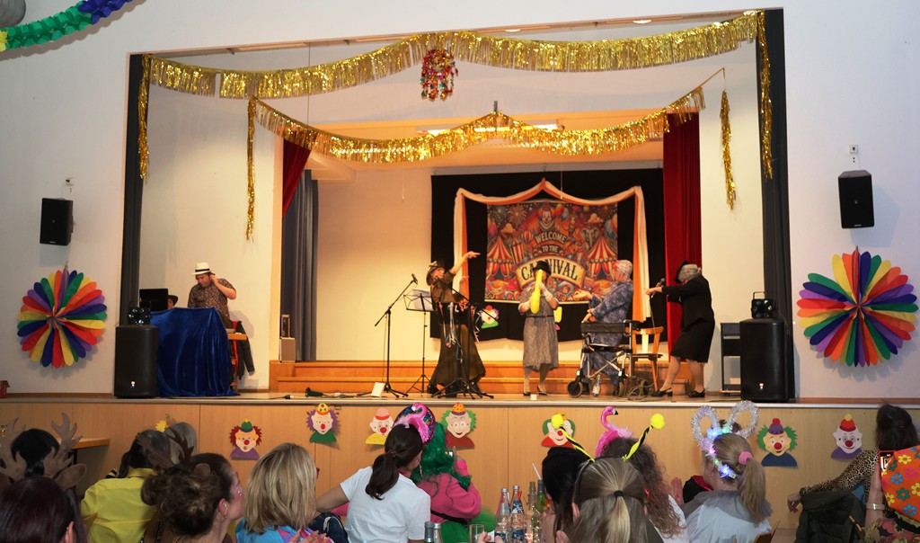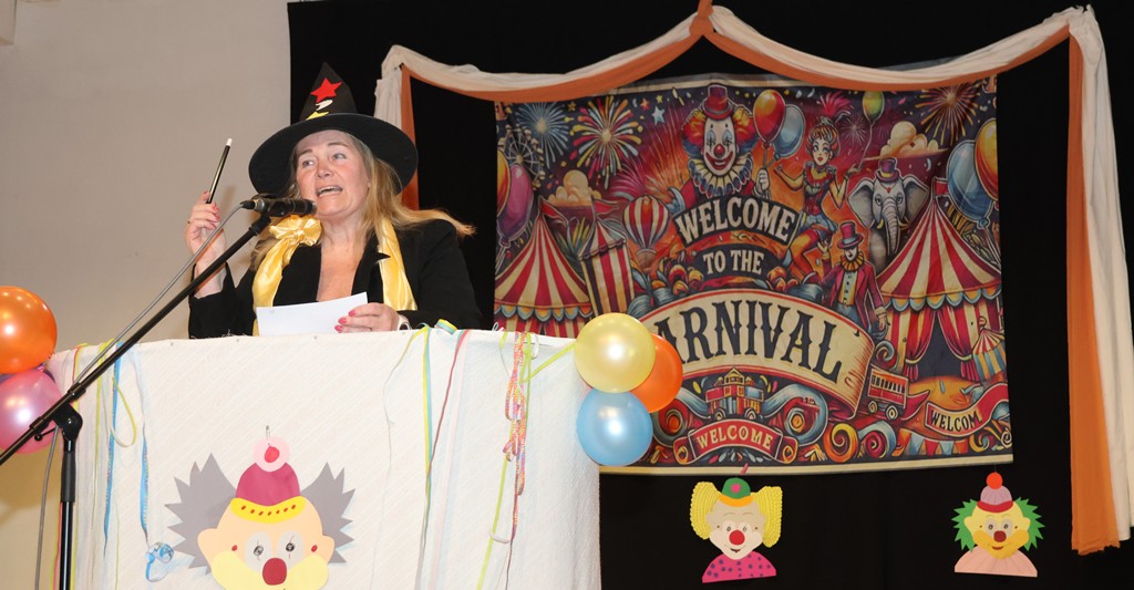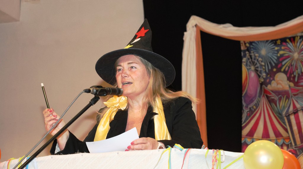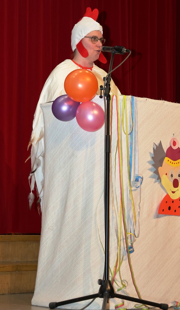 Ein schönes Bild gleich Anfangs, die Garde auf der Bühne, natürlich mit Zugabe-Rufen begleitet. Nach dem Auszug der Garde hatte Judith Müller ihren Auftritt als „Zauberer“ – Schlagwort, wie könnte es anders sein: SIM-SALA-BIM! Ihre Bütt hatte eine gewisse Würze, auch was die Finanzen der Gemeinde betrifft- kann man durch „Zauberei“ leicht beschaffen! 🙂