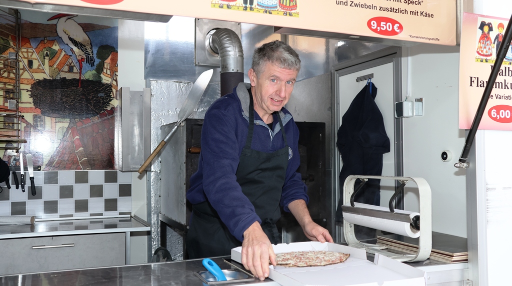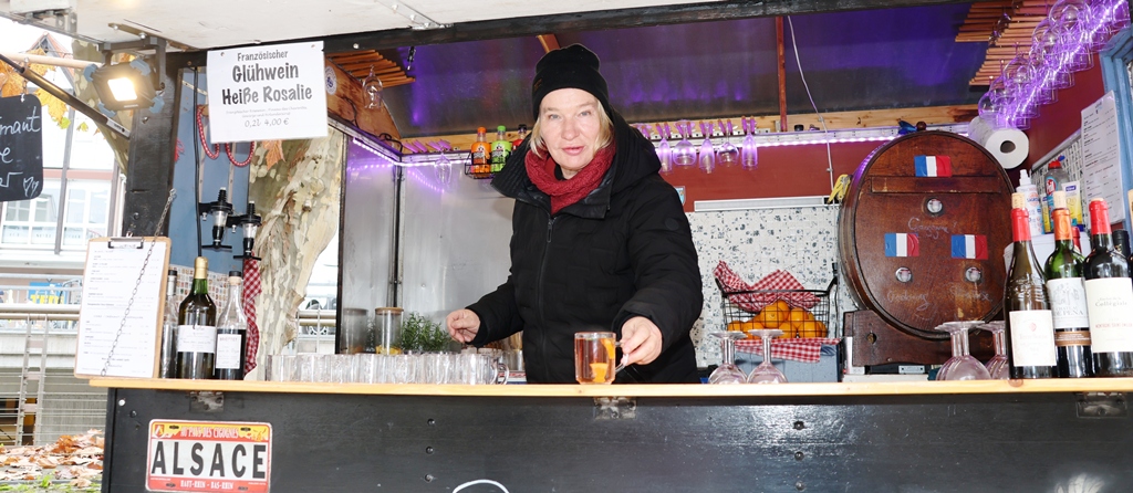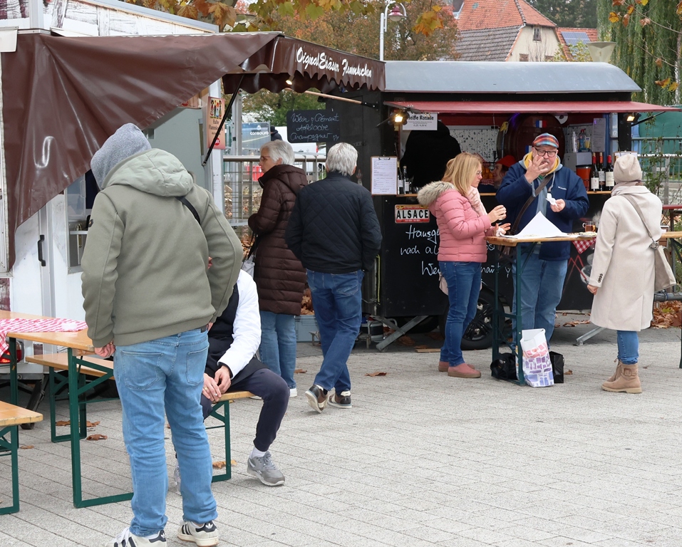 Bänke und Tische sind aufgestellt, damit man vor Ort einen Flammkuchen, einen köstlichen Cremant oder wie wir, bei den Temperaturen, einen außergewöhnlichen Glühwein geniessen kann.