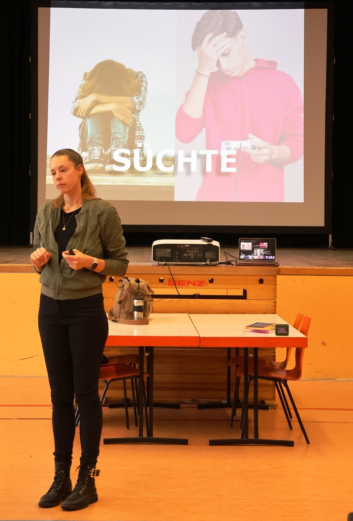 Mit einem Ausschnitt aus der Sendung „Nachtcafé“ eröffnete sie ihren Vortrag. Danach erfragte sie, was sich die jungen Menschen unter SUCHT vorstellten. Sehr gute Antworten, was man sich kaum vorstellen kann, über die sich Jugendliche in diesem Alter bereits Gedanken gemacht haben! Wir brauchen als Erwachsene das Thema „Sucht“ nicht weiter zu definieren.
