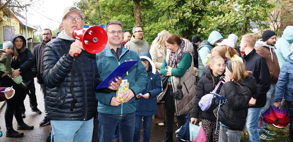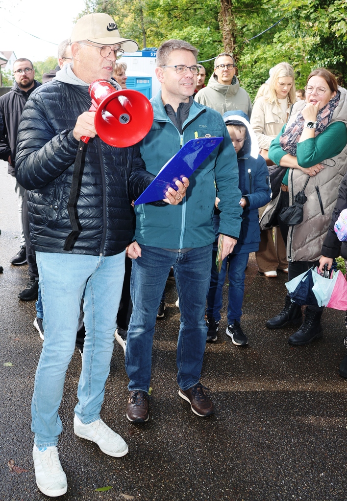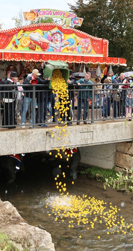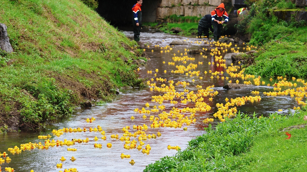 Moderiert wurde das Spektakel von Kerweborscht und Gemeinderat Becker, der immer wieder auf dem Wege am Waldangelbach entlang den Lagebericht per Megafon durchsagte! Mit einem Countdown wurde die Mülltonne mit über 1000 Enten in den Waldangelbach gekippt, und wie konnte es anders sein, es begann zu regnen …