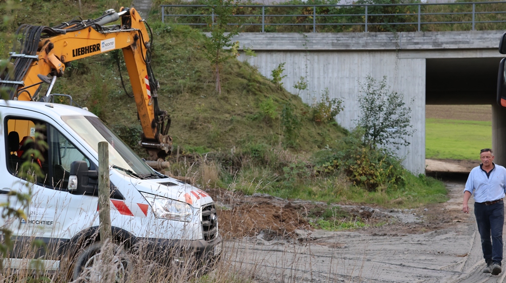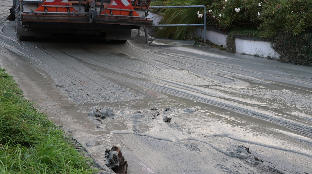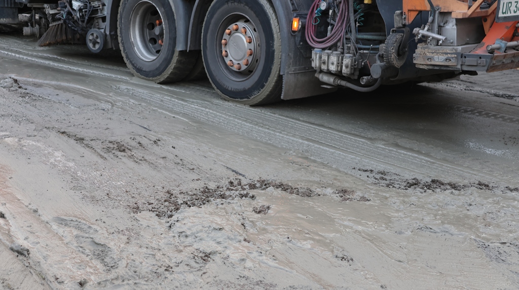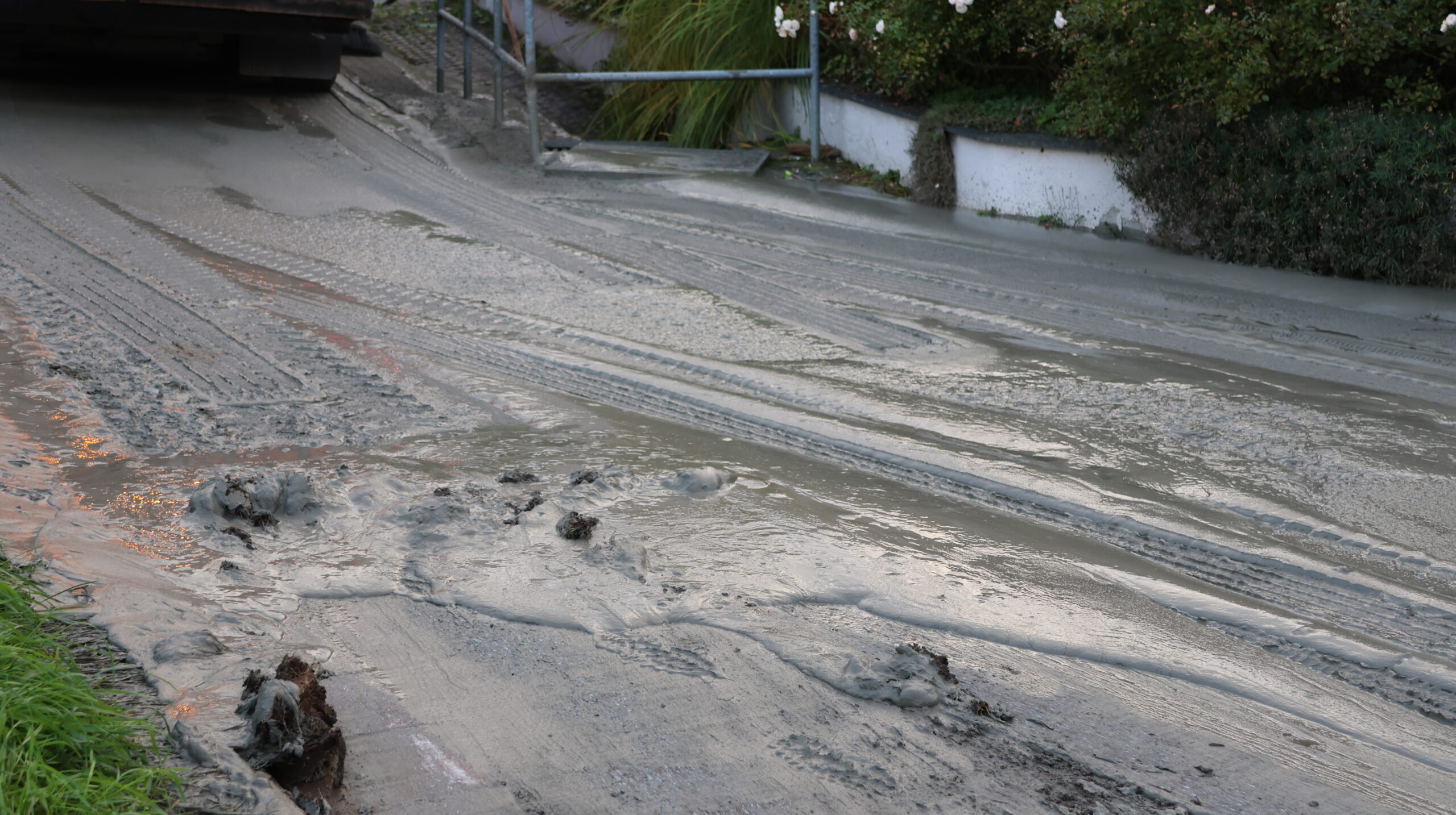 Einige viele Kubikmeter haben sich den Weg durch die Autobahnunterführeung genommen, laufen über die Straße in den Kanal. Entsorgungsfahrzeuge sind dabei das Schlimmste, das aushärten des Betons im Kanal, zu verhindern.