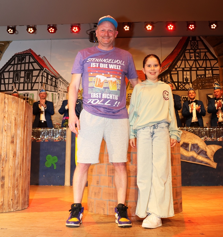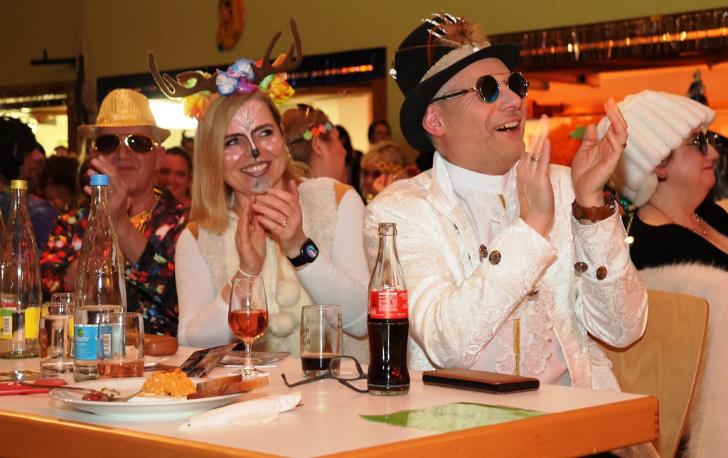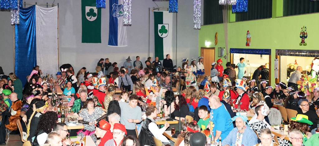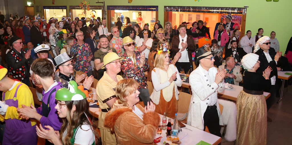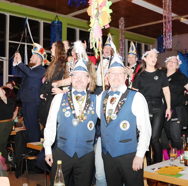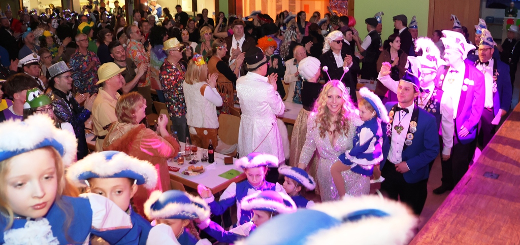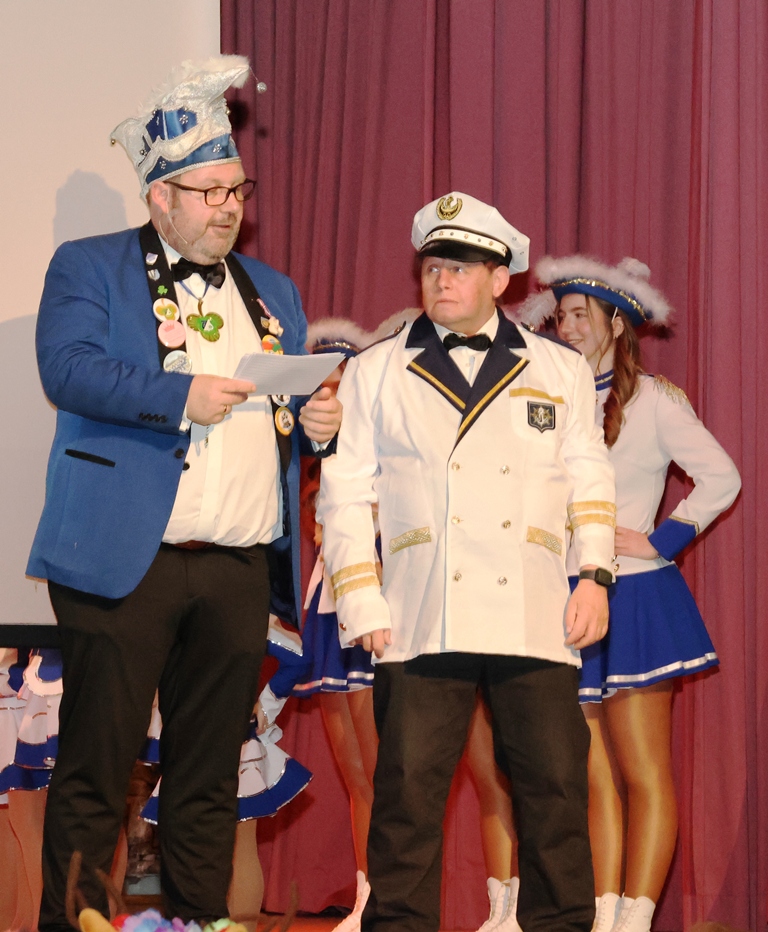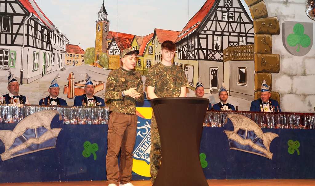 Nach der Vorstellung des Jahresordens folgte eine Schunkelrunde, ein Tanz der Minigarde und auch gleich die erste Bütt mit Noah & Mathis, die ein aktuelles Thema aus der Politik aufs Korn nahmen, bei den Jungen meist kritisch aufgenommen und auch so interpretiert worden ist …