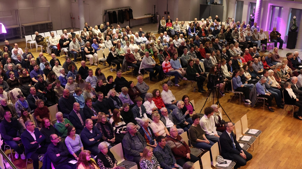 Der Saal voll besetzt, betraten die Protagonisten die vorbereitete Bühne und nahmen auf ihren Stühlen Platz. Beifall des Publikums waren Motivation einen schönen Spätnachmittag zu erleben. Die Begrüßung der Anwesenden übernahm der Vorsitzende des Verbands Andreas Sturm, er wünschte allen einen schönen Abend und kurze Zeit später erschien der „große Meister“ auf der Bühne, begrüßte die Anwesenden ebenfalls und nicht zu Letzt seine Musikerinnen und Musiker mit einem freundlichen Lächeln. So kennen wir Dominik Koch schon lange und wissen um seine herzliche Art!
