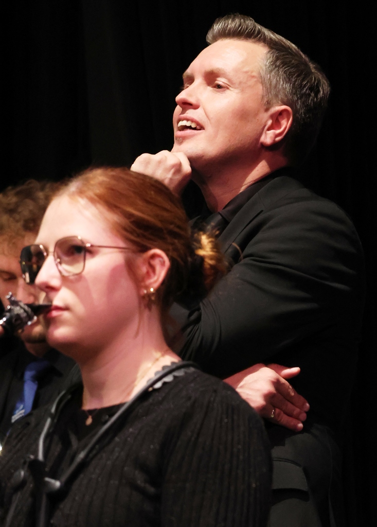 Mir welchem „körperlichen “ Einsatz Dominik Koch sein Orchester führt zeigt, dass er die Musik lebt! Auch seinen Dank an die Musikerinnen und Musiker zeigt er ihnen mit angedeutetem Beifall an.