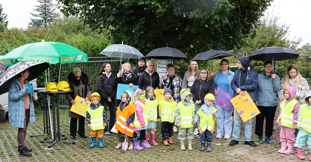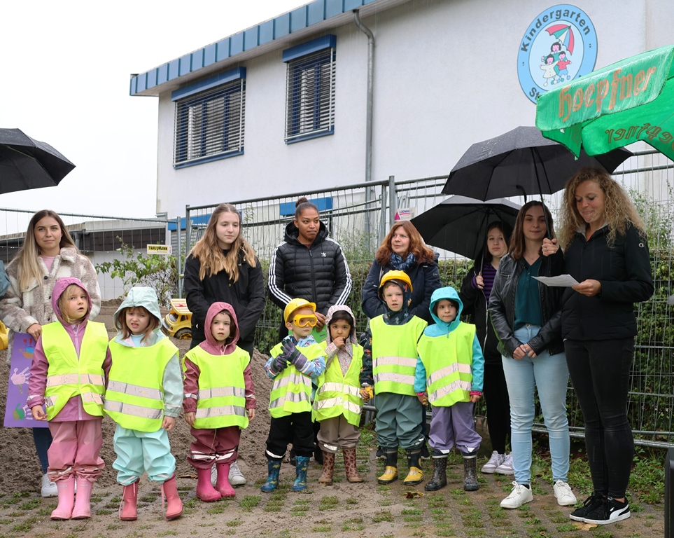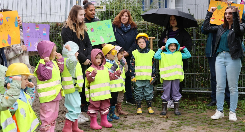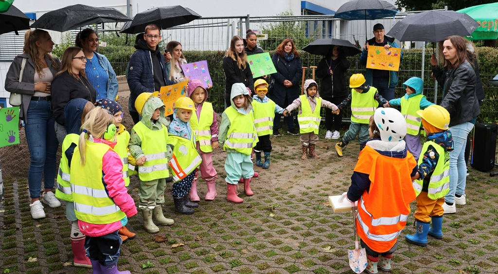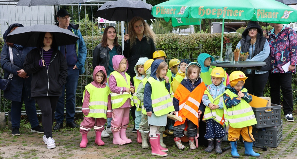 Mit Warnwesten und Baustellenhelmen rückten die Kindergartenkinder an und stimmten – dem Regen trotzend – das Lied „Gemeinsam sind wir stark“ an.